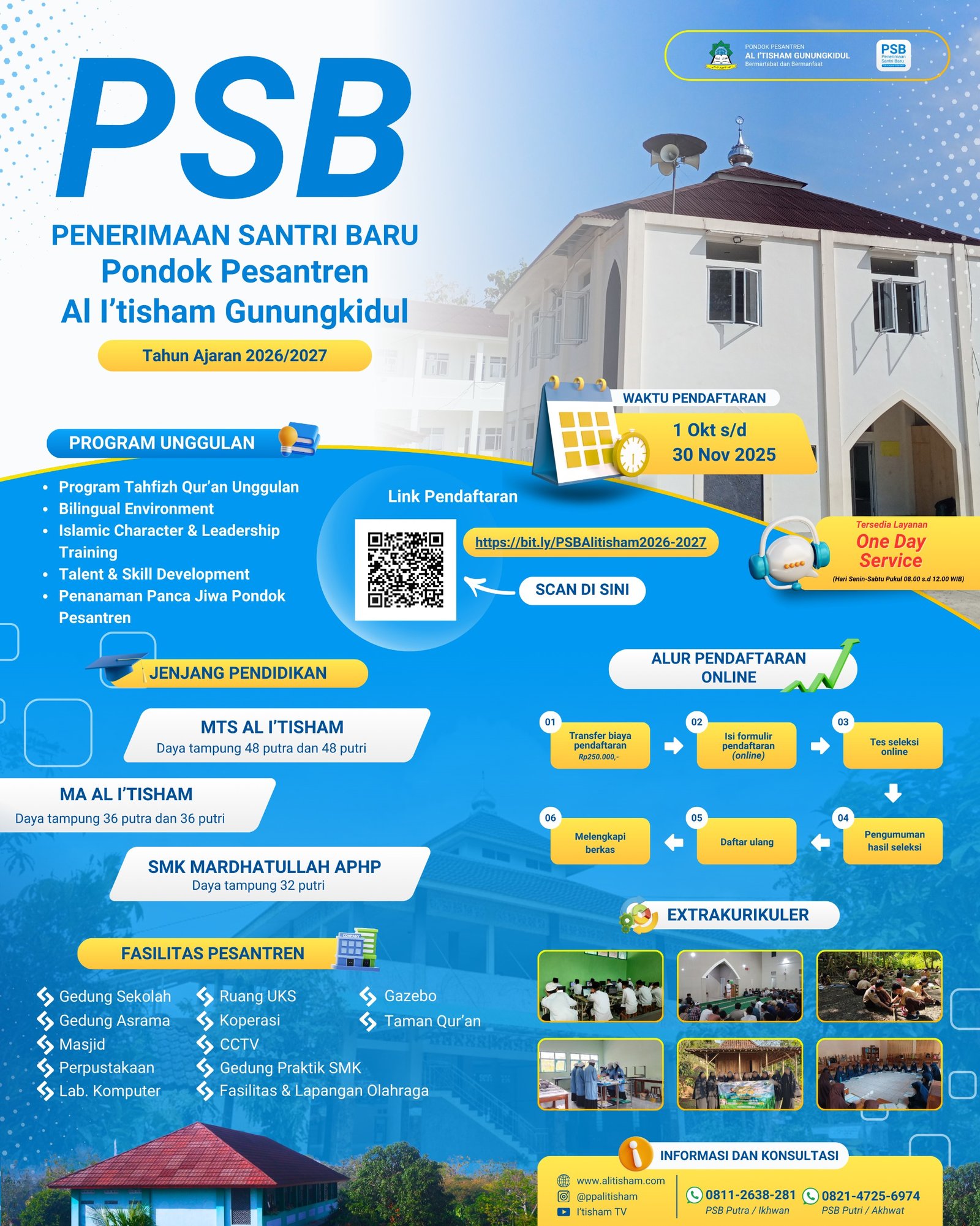 📝 Pendaftaran Offline silahkan bisa datang langsung ke PP Al I’tisham pada Hari Senin-Sabtu Pukul 08.00 s.d 12.00 WIB, atau dapat menghubungi salah satu kontak di bawah :